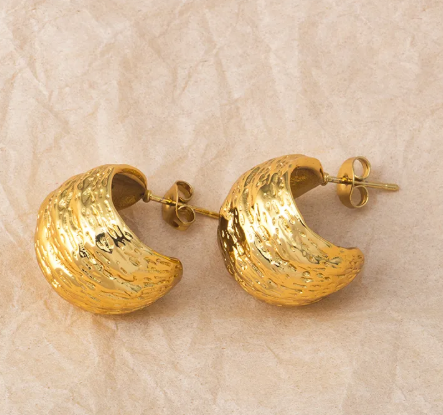 Arracadas gruesas con relieves. Diseño elegante en acero inoxidable con acabado dorado y plateado. Ligeras, modernas y perfectas para el día a día.