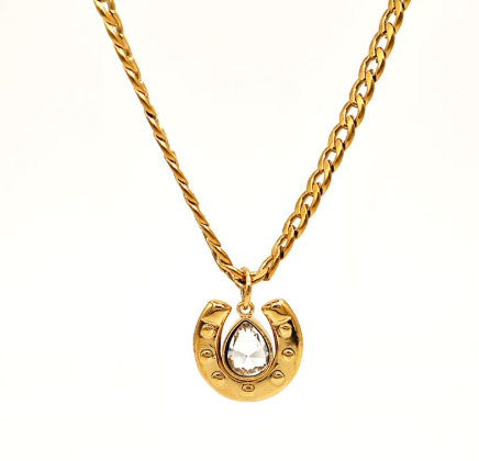 Collar con dije de herradura y circonia. Color dorado.