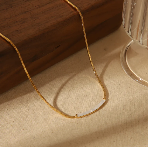 Collar con figura de concha nácar. Diseño moderno en acero inoxidable con acabado dorado. Un accesorio versátil, sutil y duradero para cualquier ocasión.